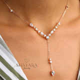 שרשרת עניבה יוקרתית מכסף סטרלינג 925 בציפוי רוזגולד אלגנטי, המשובצת באבני זירקון נוצצות בצורות שונות – מרובעות, טיפות ויהלום. השילוב בין הגוון החמים של הרוזגולד לניצוץ הזירקונים יוצר מראה יוקרתי, עדין ונשי במיוחד.